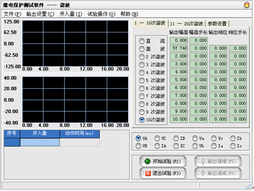 在微機繼電保護測試儀中部的輸入框中設置“輸出幅值”、“幅值步長”、“輸出相位”、“相位步長”,微機繼電保護測試儀各電壓、電流的各次諧波幅值在界面上以“伏特”或“安培”為單位顯示其值,微機繼電保護測試儀輸出的值為界面上實際顯示的電壓電流大小。變量的變化步長應根據測試的要求選擇合適的大小,一般地,步長越小,測試精度越高。