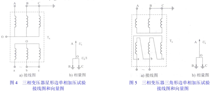 圖 6 為通過星形低壓側兩相并聯和另一相串聯單相加壓,高壓側中性點接地,使高壓側被試相對地電壓達到試驗電壓,線間電壓達 1.5Us。