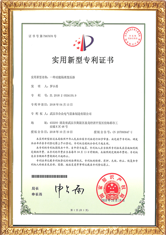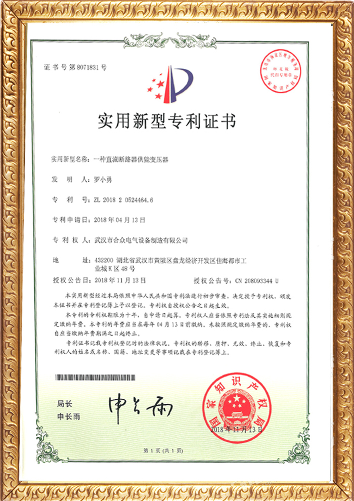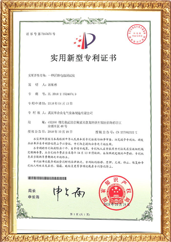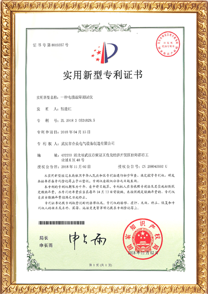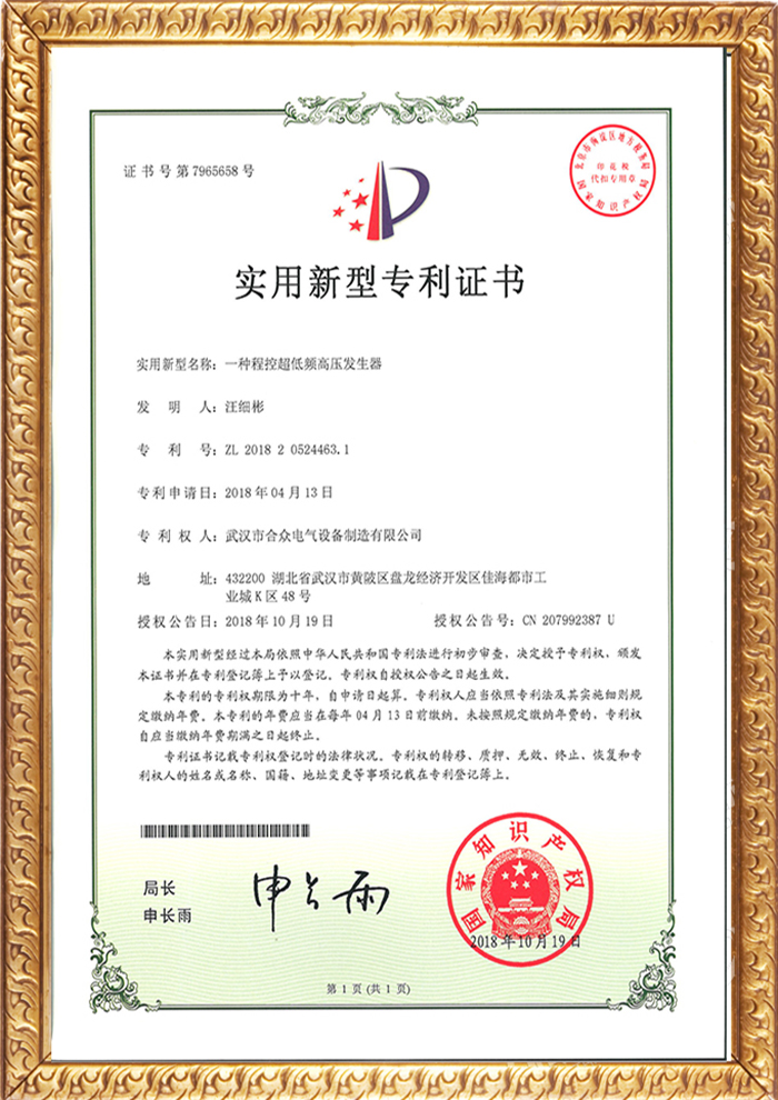 變頻串聯(lián)諧振耐壓試驗(yàn)裝置專利證書