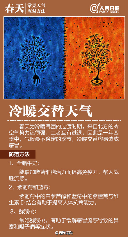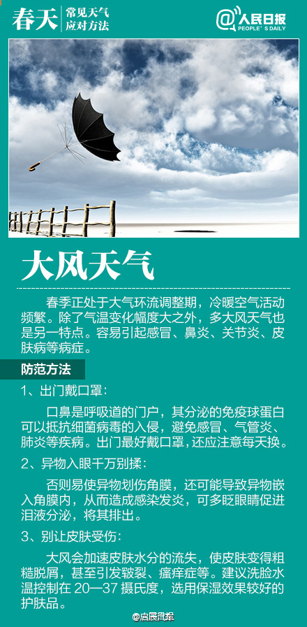 如何應對初春多變天氣作者:合眾電氣發布時間:2016-03-23瀏覽量:11181 次字體顯示:【大】【中】【小】 春季天氣調皮,昨天還日光融融閑賞花,今日就寒風瑟瑟緊添衣!大風、沙塵、陰雨等交替上演,讓感冒、過敏、關節炎等進入高發期。今天#世界氣象日#,四張圖教你應對春季多變天氣! 上一篇: HZXC-104D變壓器智能控制箱最新發貨現場下一篇: 面對問題疫苗,我們怎么辦?