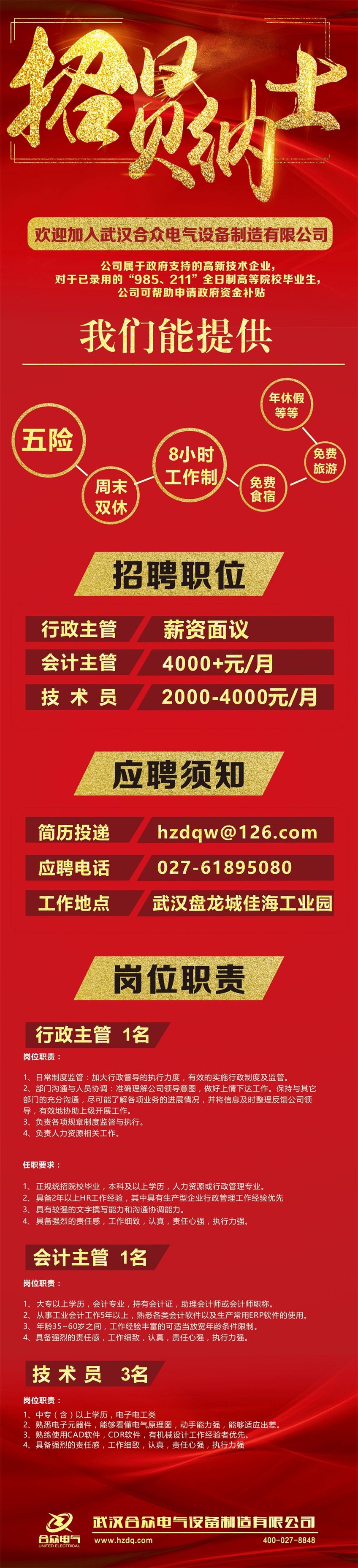 武漢市合眾電氣設備制造有限公司成立于2002年,注冊資金2100萬元,是一家專業(yè)生產(chǎn)和銷售電力檢測、試驗設備的高新技術企業(yè)。公司擁有大批多年從事高電壓試驗、檢測設備設計、生產(chǎn)的專業(yè)技術人才,嚴格按照國際化標準管理企業(yè),嚴格執(zhí)行ISO9001國際質(zhì)量體系標準,堅持不斷改革、創(chuàng)新。經(jīng)過多年積極努力經(jīng)營,已成長為一家集科研、開發(fā)、生產(chǎn)、銷售、服務為一體的高科技現(xiàn)代電力設備生產(chǎn)企業(yè),獲得行業(yè)眾多榮譽,得到行業(yè)一致認可。公司重視人才的培養(yǎng),定期為員工提供專業(yè)的技能培訓,為每位員工提供廣闊的發(fā)展平臺,現(xiàn)因公司的業(yè)務的拓展和規(guī)模的擴大,現(xiàn)招募以下職位,歡迎各位滿足條件的朋友踴躍報名,一經(jīng)錄用待遇從優(yōu)!