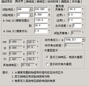 微機繼電保護測試儀的測邊界作者:合眾電氣發布時間:2021-08-16瀏覽量:3940 次字體顯示:【大】【中】【小】 微機繼電保護測試儀的測邊界。 測邊界 自動測試出方向性保護的兩個動作邊界,并且自動計算出最大靈敏角。在“顯示動作角矢量圖”的顯示方式下,從主界面右側的圖中可以很直觀地觀察到兩條邊界線和最大靈敏線。上一篇: 微機繼電保護測試儀試驗參量下一篇: 微機繼電保護測試儀測試項目的界面說明