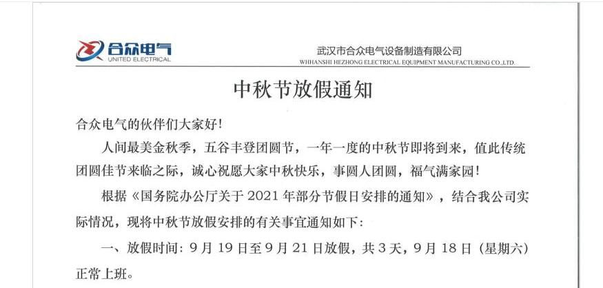 合眾電氣中秋節(jié)員工福利及放假通知