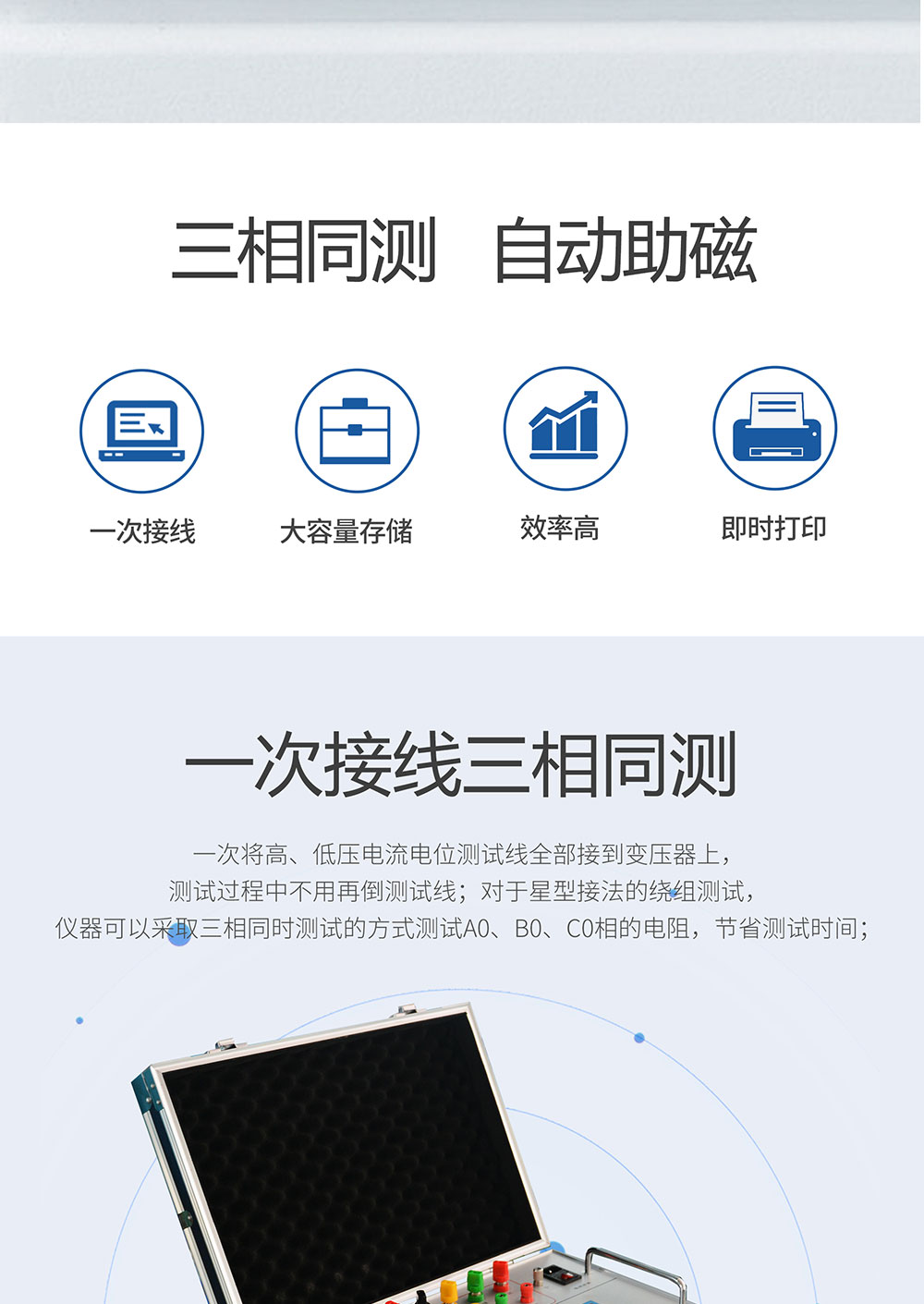 三通道直流電阻測試儀(以下簡稱直阻儀)是變壓器直流電阻測量的最新一代產(chǎn)品,是為測量大容量變壓器三相繞組直流電阻而優(yōu)化設(shè)計的。可對變壓器的三相繞組直流電阻進(jìn)行同時測試。對有載調(diào)壓變壓器可以不需要放電,直接調(diào)節(jié)分接開關(guān),測量時間是傳統(tǒng)單相測量的三分之一,可大大縮短工作時間和勞動強度。