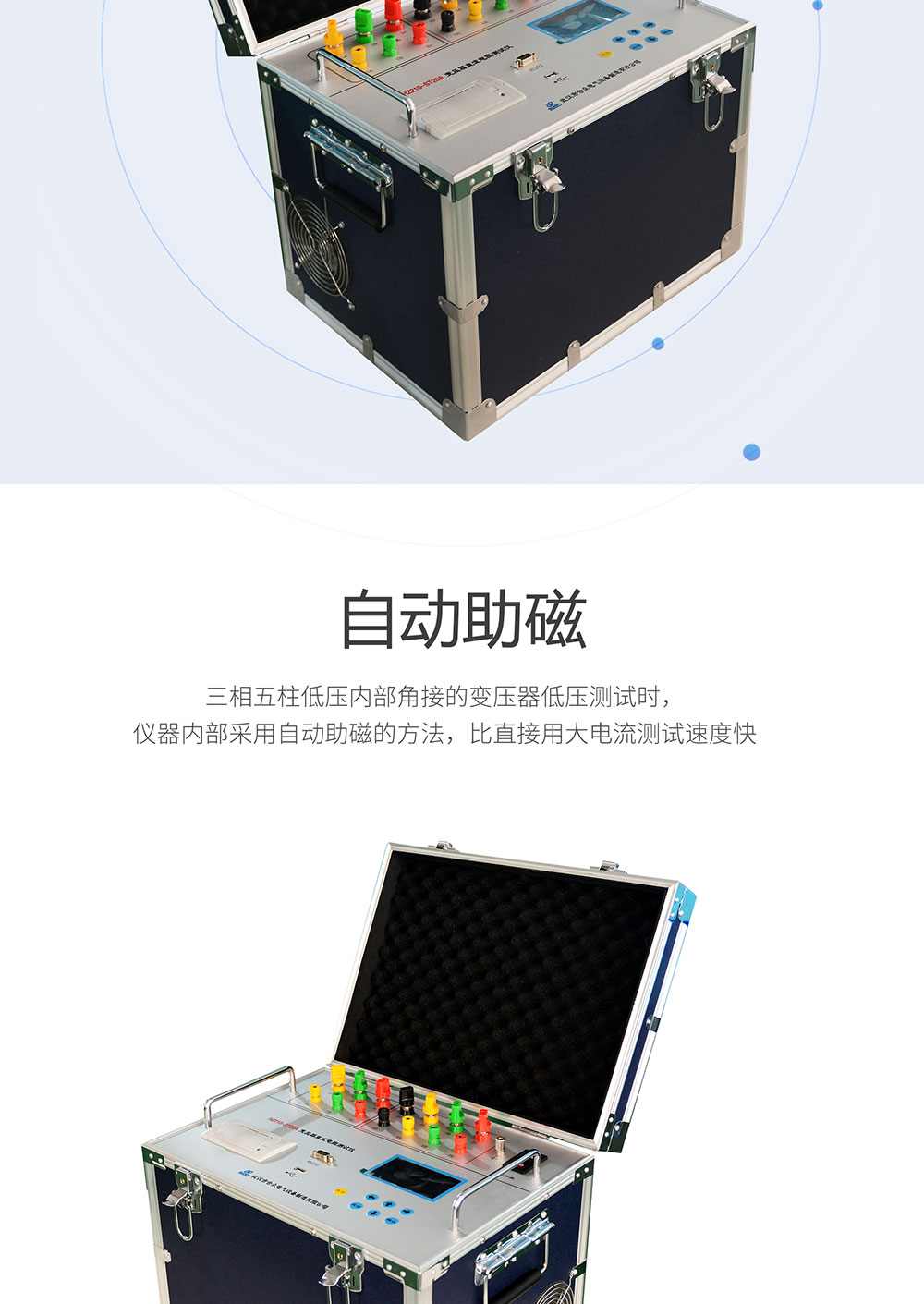 3、三相五柱低壓內(nèi)部角接的變壓器低壓測試時,儀器內(nèi)部采用自動助磁的方法,比直接用大電流測試速度快;