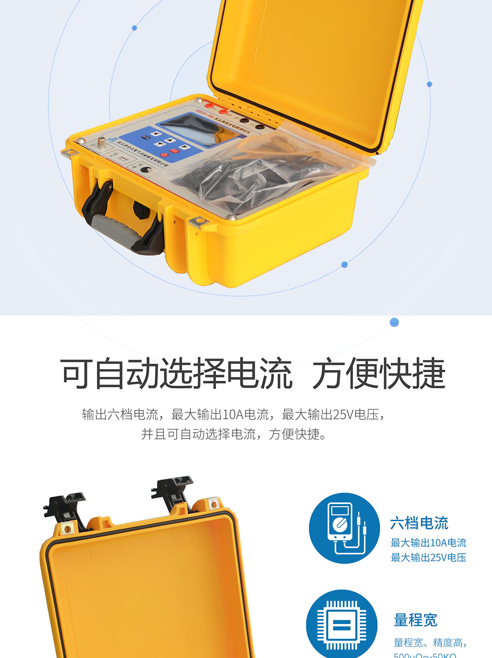 1、鋰電池供電或者220V交流供電自適應(yīng),一次充電,可連續(xù)進(jìn)行上百臺(tái)變壓器直流電阻測(cè)試,測(cè)試過程簡(jiǎn)單、方便。
