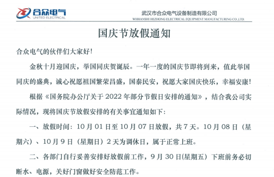 武漢市合眾電氣2022年十一國(guó)慶節(jié)放假通知